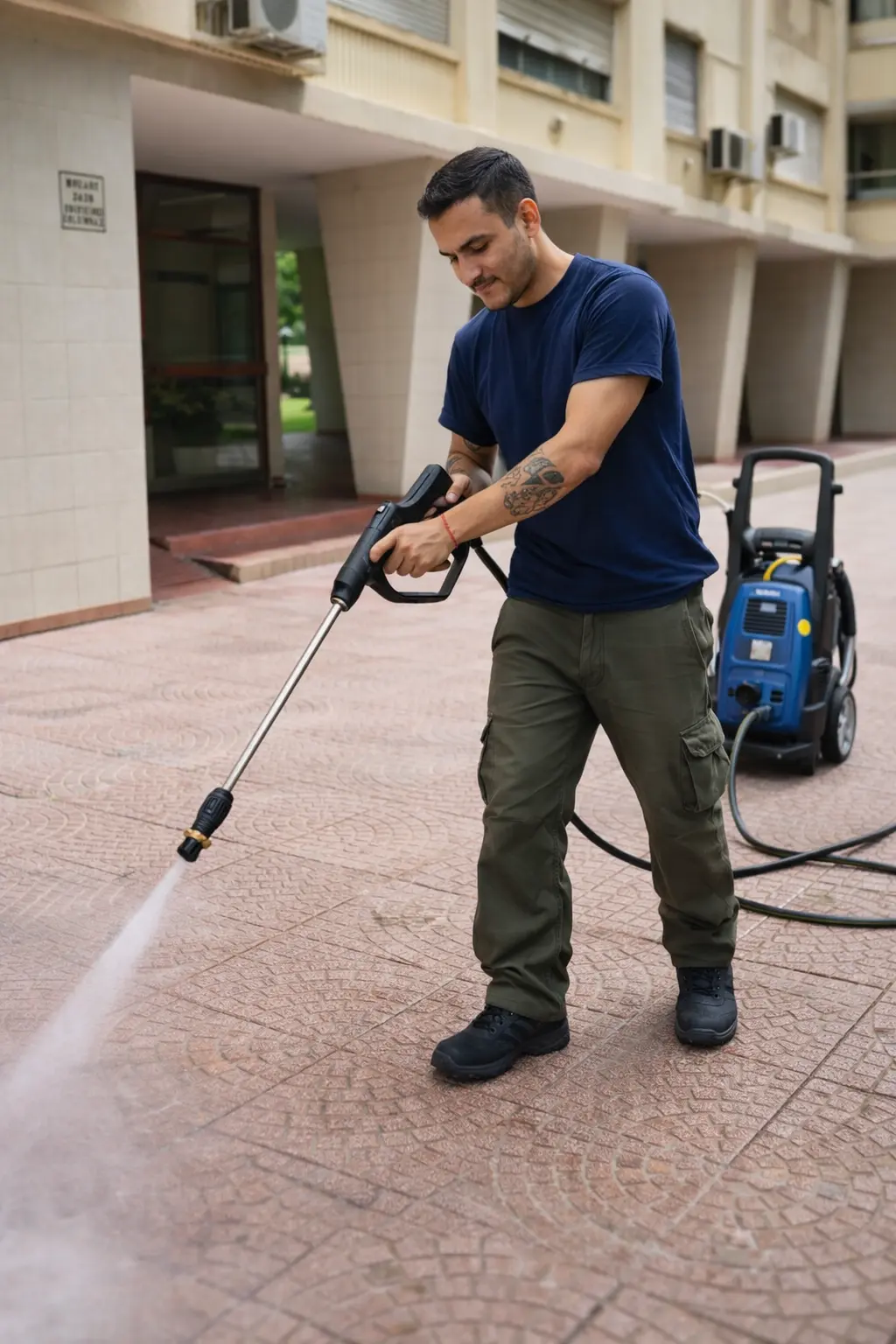 - Limpieza de paredes y suelos con hidrolavadora: Limpieza con hidrolavadora de baldosas, concreto y otras superficies resistentes, tanto interiores como exteriores..
